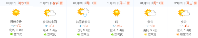 初三到初六,晴间多云天气,初四早晨气温最低,市区可达-6℃左右,其他区市-12至-8℃,之后气温缓慢回升,风力3-4级为主,对污染物的扩散不太有利,初五、初六可能有雾。