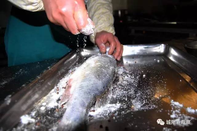 ▲将食盐均匀地撒在鱼身上