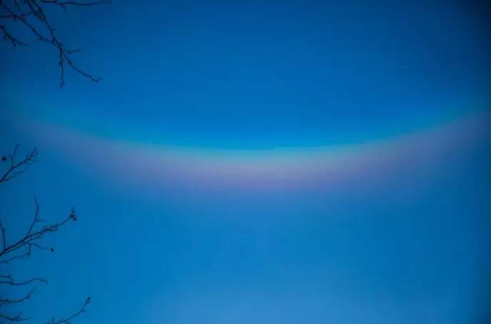 太阳光穿过云层当中的冰晶后在天空中形成如倒挂的彩虹一般的七色圆弧。其颜色顺序自下而上分别为:红、橙、黄、绿、蓝、靛、紫。