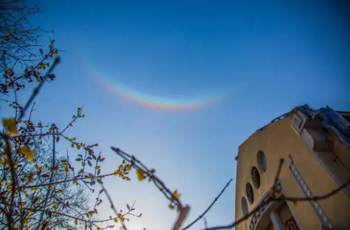 ▲2月7日下午四点到四点半,在青岛市南区老城区一带都可以看到神奇的倒挂彩虹。这种彩虹看上去就像天空在神秘地微笑,因此被称为“上帝之眼”。在科学上称为“环天顶弧”、“幻日弧光”。(摄影:韩丰杨志文)