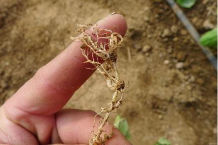 由于根系受到损害,根系活力下降,对营养和水分的吸收、输送变差,根部生长受阻而常出现不长新根的现象。另外在根结线虫危害严重时,根腐病、枯萎病等病菌与线虫共同危害,造成烂根、根腐,进而影响病株的生长。一般来说,病株在受害初期症状不明显,长不快、矮小、果实小且少,与缺水缺肥症状相似。在受害中后期,植株早衰退化、萎蔫,甚至是枯萎而死。