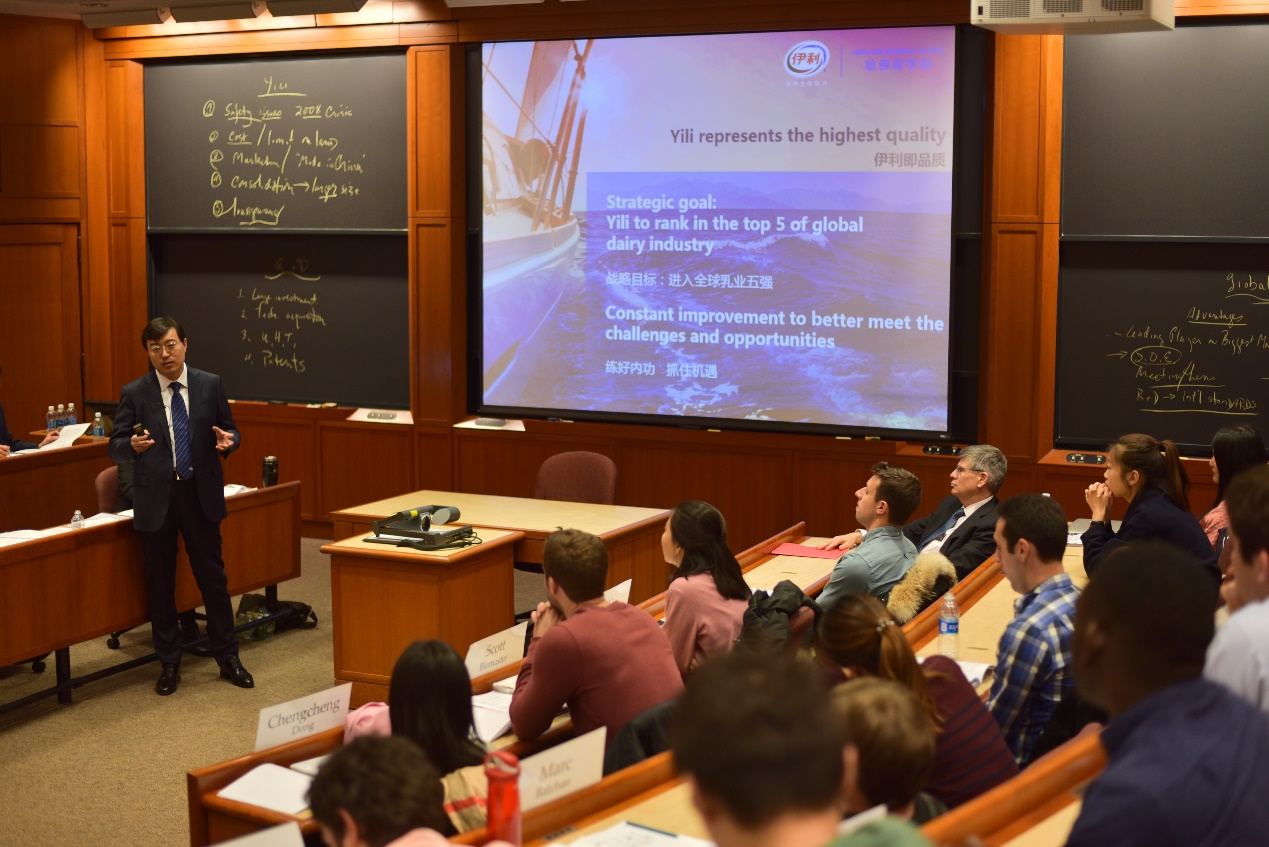 伊利集团董事长潘刚(左一)在哈佛大学给MBA学员授课
