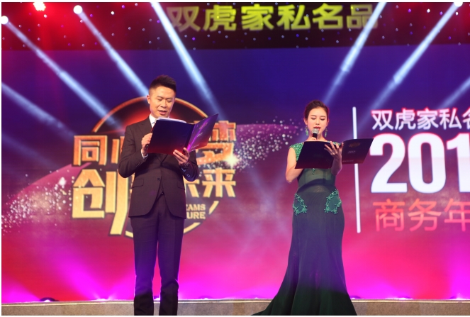 尹磊女士向经销商家人、公司各中心领导,公司全体员工致以节日的问候,并提出,2017年,是双虎人励精图治新的一年,双虎人将会与经销商家人共同努力,不断向前,铸就辉煌。