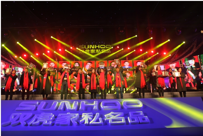 13日双虎家私名品的颁奖盛典隆重召开,会上为2016年表现优异的经销商颁发了奖项,以表彰他们为公司做出的杰出贡献。典礼中,各式各样的节目精彩绝伦,使得现场气氛高潮迭出,欢欣雀跃,