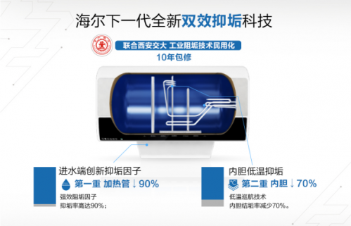 海尔下一代双效抑垢技术由海尔热水器与西安交大联合研发。这一技术可有效阻隔水垢形成,使加热管结垢率降低90%,内胆结垢率降低70%。同时,经过三级净化和三重抑菌功能可去除99%以上的泥沙铁锈、余氯、重金属等杂质和99.9%的细菌,从而实现水质的净化,是一款能“自己洗澡”的热水器。