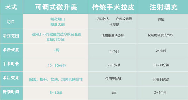 可调式微升美的三合一,也是中国整形美容界年轻化技术的新亮点,包含面部除皱、面部提升、焕肤修复。让我们用一张表格来看清可调式微升美与其它美容方式的区别。