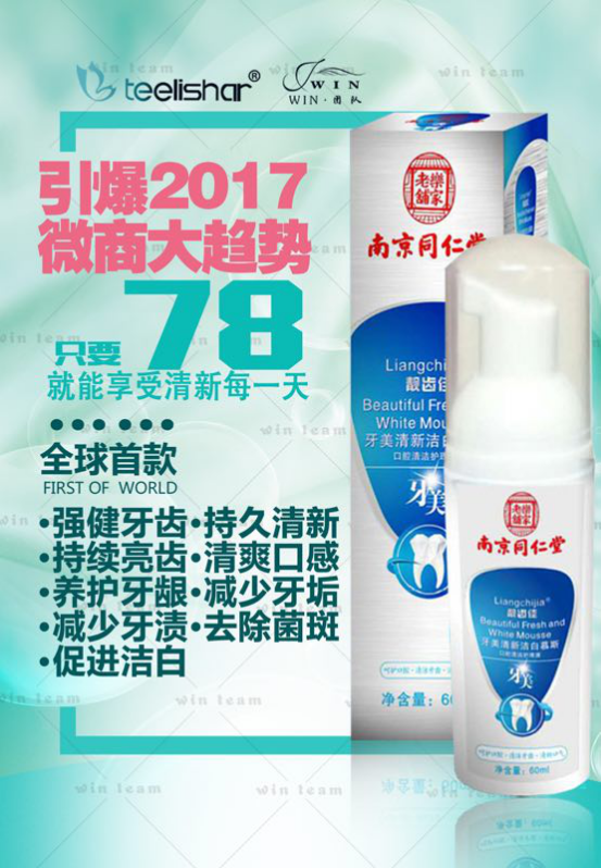 做微商的都知道,代理商想做微商,找的一定是长线品牌。缇丽莎尔2017年开年巨献新品——南京同仁堂牙美火热上市,做微商的朋友肯定听过珍嗖啦,没错微商排名第一的产品,3年来排名NO.1。如果你错过了珍嗖啦,那么千万不能错过我们2017年的火爆新品《牙美》。
