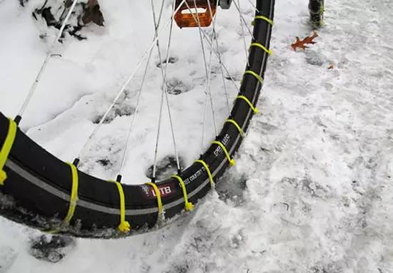 此外,分享一个超低成本的“自行车防滑链”的DIY秘籍。图片中黄色塑料绳子,就是维修电脑时常用的电线捆扎带,准备比较粗壮的捆扎带若干,在每根辐条之间交替方向捆扎到轮胎上,用钳子拉紧,剪掉多余部分,大功告成!