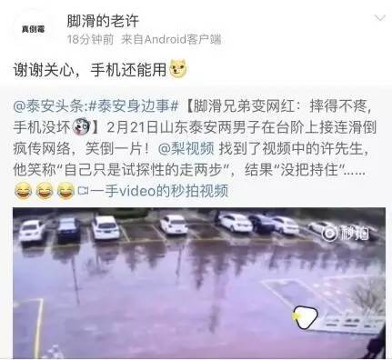 据当事人的女朋友@刘韵冰Miss:昨天晚上他跟我说他摔了二十几个台阶,我当时是心疼的(认真脸),可看到视频以后,我一天都笑得像个傻子一样……哈哈哈哈哈哈……