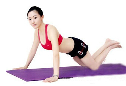 2.跪地俯卧撑:双膝跪地,弯曲双腿,始终保持大腿与小腿间为90 度左右。两手撑地,两掌宽度约大于肩宽。慢慢曲肘,将胸部使劲贴地后起身。