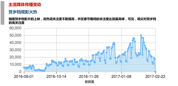 据译见大数据分析平台搜索关键词“2017春节电影”显示,随着贺岁档影片《长城》、《铁道飞虎》、《西游伏妖篇》、《大闹天竺》、《乘风破浪》、《熊出没》等影片的上映,该热词关注度不断提高,并在春节期间的关注度达到最高峰,可见观众对贺岁档的高关注度。