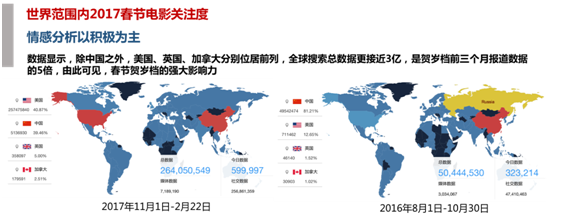 网易新闻《从贺岁电影到贺岁档电影》一文中提到,贺岁档是目前国内最完善、竞争最为激烈、票房产出能力最高、消费能力最强的电影档期,备受国内外关注。在译见大数据分析平台上也得到了证实,据译见分析数据显示(红色代表话题热度最高),除中国之外,美国、英国、加拿大分别位居前列。而全球搜索总数据更是接近3亿,是贺岁档前三个月媒体报道数据总数据的5倍,由此可见,春节贺岁档的强大影响力。
