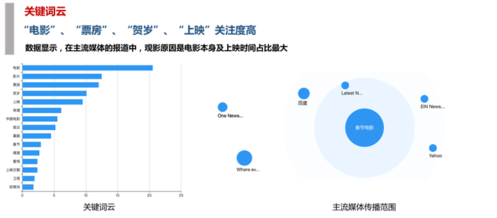 每年的春节贺岁档首当其冲会成为最为热议的话题,通过译见大数据平台分析,“2017春节电影”专题整体印象为“电影”居多,其次分别是“影片”、“票房”、“贺岁”、“上映”等。主要媒体传播范围分别是百度、Yahoo等。可见,在主流媒体的报道中,观影原因是电影本身及上映时间的占比最大。