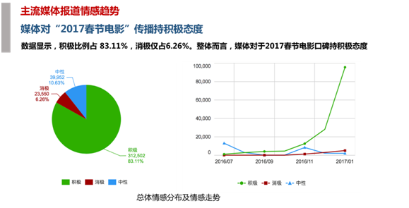 对于2017春节电影的情感趋势,译见大数据平台也给出了相应数据,数据显示积极比例占83.11%,消极仅占6.26%。整体而言,媒体对于2017春节电影口碑持积极态度。从情感走势不难看出,自贺岁档开始,情感走势不断提升,媒体积极报道数据已接近10万,而2016年7月到10月媒体积极报道数据总和仅不到2万,5倍的巨大差距,可见贺岁档的强大情感攻势。