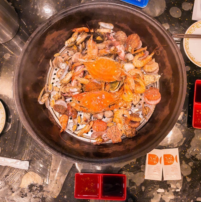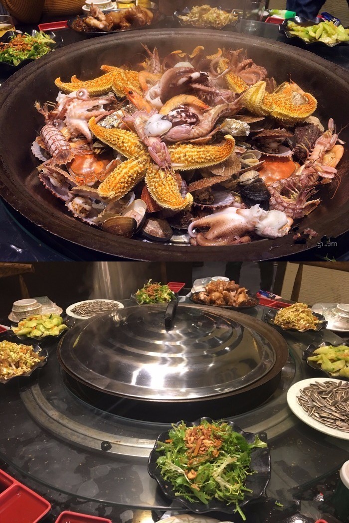 【上层】蒸的是活虾、蛤蜊、扇贝、比管鱼、刀鲜、小海螺、海砺子、美白贝、毛蛤蜊…蒸好后的海鲜可以蘸料汁食用,也可以单纯的品尝到海鲜最原本的味道。【下层】可以选择各种鱼。等吃下层的时候,海水豆腐是提前加入的。再加入胶东大白菜炖煮就可以享用了。锅边可以烙饼子,生猛海鲜在水蒸气作用下鲜味被完全激活,与此同时水蒸气凝成的水珠混合了海鲜的精髓熬煮出了一锅令人垂涎的海鲜汤。