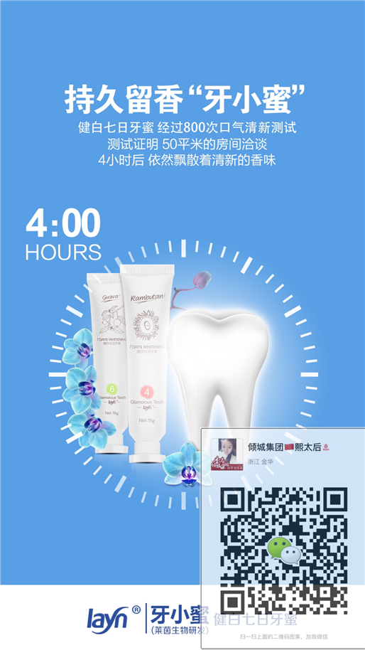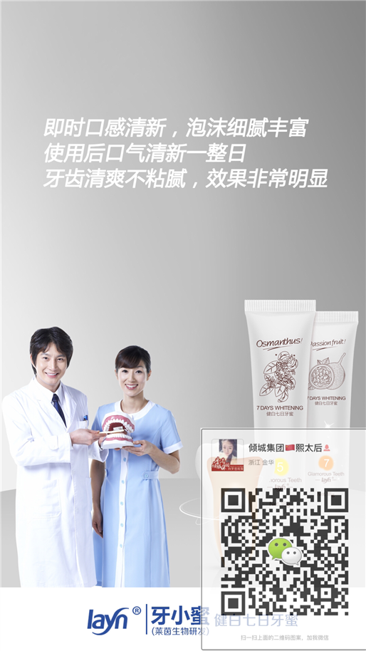 莱茵“牙小蜜”健白七日牙蜜告别传统口腔护理产品,为口腔护理市场带来新的生机与活力,以革命性理念颠覆口腔护理习惯,成为新一代口腔护理产品!莱茵牙小蜜股东创始人张灿希微信:ds_forget,245346176,电话13554699137。 1487918161