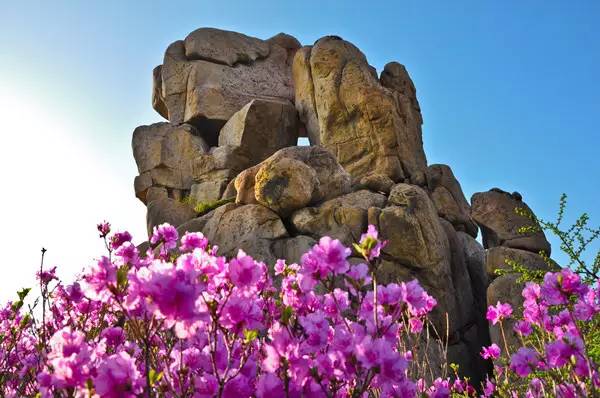 “人间四月芳菲尽,山寺桃花始盛开。”远山起伏连绵,浅紫淡粉的杜鹃绽放峻山,冷峻柔情恰似春如玉。