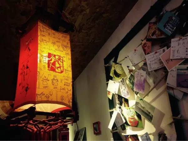 里面别有洞天。迎面而来的是楼梯,还有一个壁炉,左边是宽敞的房间,可以容纳四桌客人。店里摆满了各种干花,小装饰品,头顶的灯是布艺灯笼的造型,别有一道风味。