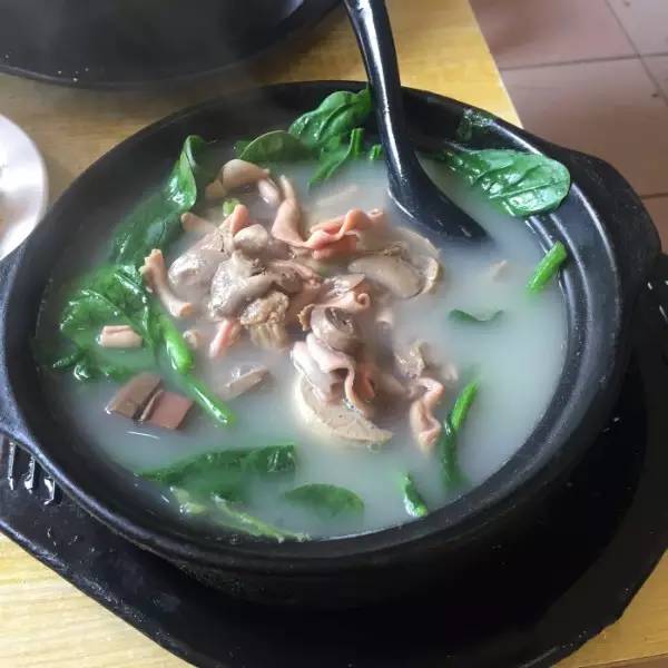 汤的味道确实不错,满满的一锅,鸭腿肉也是很有滋味,汤里面的鸭胗很好吃,还有菠菜。用醋调味真的好吃哦。凉菜的拌鸭肠,半份够吃的。千万别忘了要点烤火烧,绝配的。