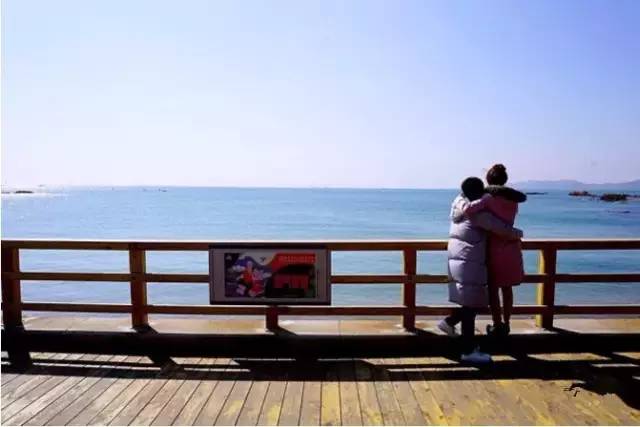 沿着黄海路下行,就到了滨海木栈道太平角一段,一对情侣面朝大海相拥依偎,恋爱的时光,真好。