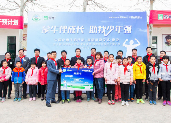 3月20日,“中国小康牛奶行动”助学捐赠仪式在山东泰安徂徕镇北望小学桥沟教学点举行,蒙牛向全校286名学生捐赠了满足其1年饮奶量的学生奶,共计51480包。农业部畜牧业司副处长邓兴照、中国奶业协会副秘书长邓荣臻、蒙牛集团副总裁石东伟等相关领导出席捐赠仪式。吉林农业大学甄玉国教授、山东农业大学王中华教授还为学生们带来了一堂生动的营养科普课。
