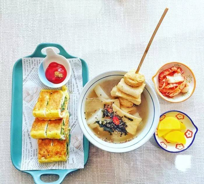 好久没有在这种价位的地方见到长得这么好看的菜了。奶酪鸡蛋卷绝对是大爱,口感清新微甜,蛋卷厚实;韩式金枪鱼拌饭,韩式烤肉炒年糕,韩式鱼饼汤,拌饭里的配料丰富,搭配着金枪鱼和烤肉的口感更为清口,入口绵香。