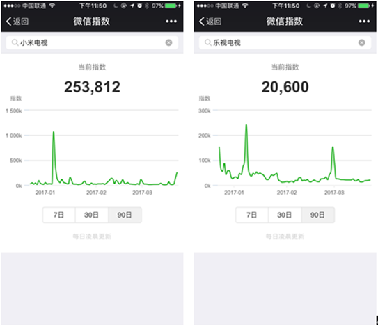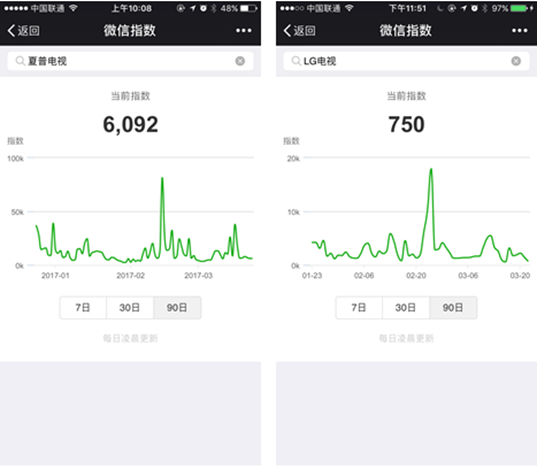 昨天刷爆朋友圈的除了国足1比0战胜韩国外,那就是微信指数的悄然上线,据悉该指数主要反应关键词在微信内的影响人数,所以很快朋友圈就涌现出各种晒奇葩关键词微信指数的。笔者也好奇的查询了下竞争激烈的电视行业微信指数,发现了惊人差距。