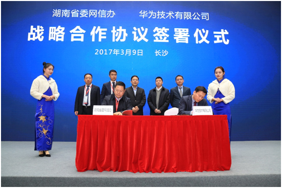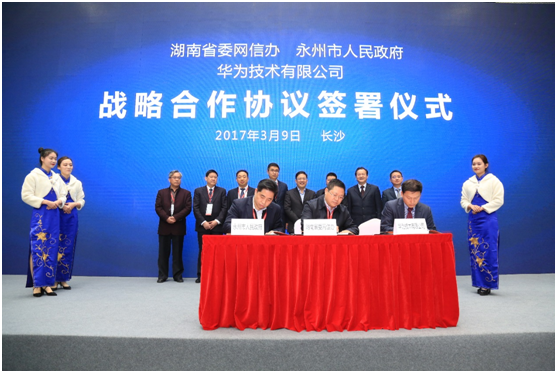 【中国,长沙】2017年3月9日湖南省委网信办、永州市人民政府、华为公司在2017华为中国区生态伙伴大会上签订战略合作协议,三方将会在网络安全和信息化领域展开深度合作,依托永州华为企业云平台,共同加快推动党政机关网站云化、永州华为云计算大数据基地和新型智慧城市试点项目建设。湖南省委副秘书长、省委网信办主任卿立新, 永州市委副书记、市人民政府市长易佳良,华为公司中国地区部总裁彭中阳等出席签约仪式。