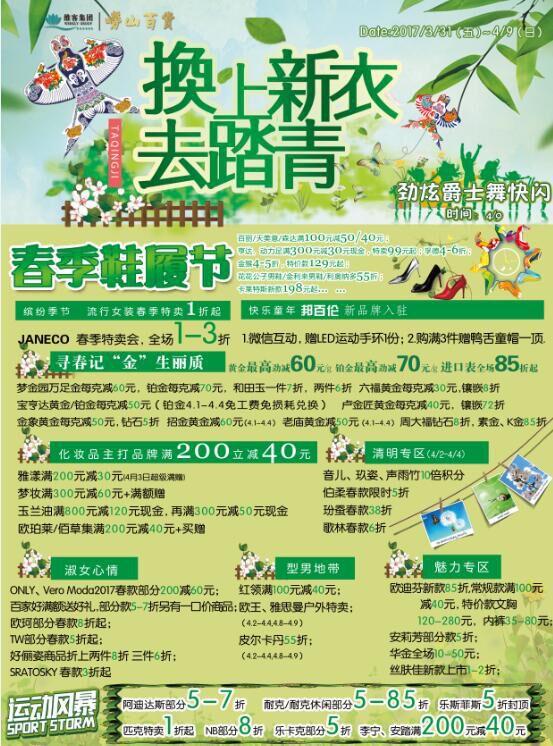 ONLY、 Vero Moda2017春款部分200减60元; 百家好满额送好礼,部分款5-7折 另有一口价商品; 欧珂部分春款8折起; TW部分春款5折起; 好俪姿商品折上两件8折 三件6折; SRATOSKY 春款3折起