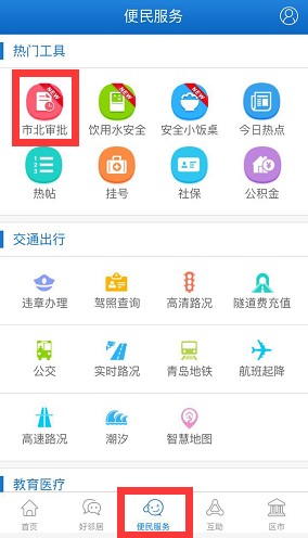 2.点击最下方菜单“便民服务”,选择“市北审批”。