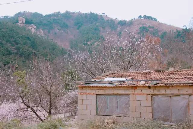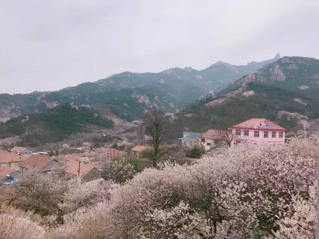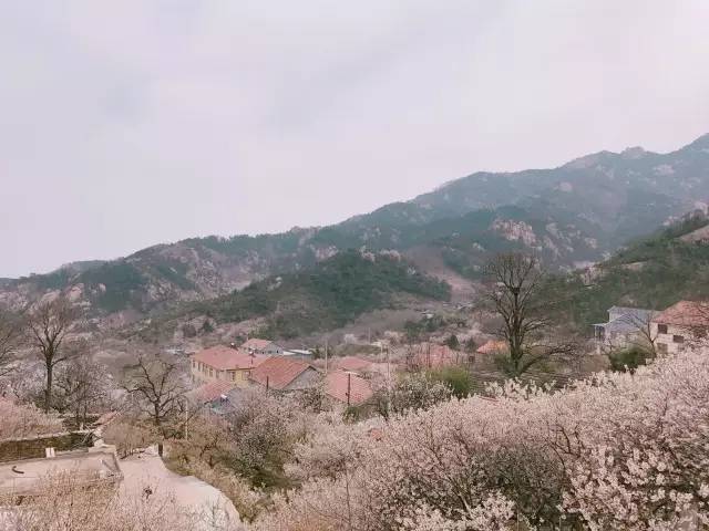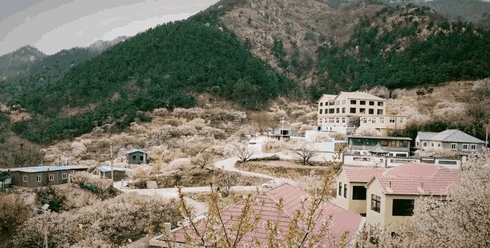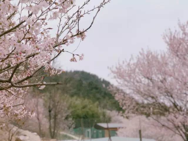 远处的小村落被漫山遍野的樱花点缀的分外美丽,粉嫩了一片山海,古朴的村庄就这样被花海包围着,恍若进入一片十里樱花林。