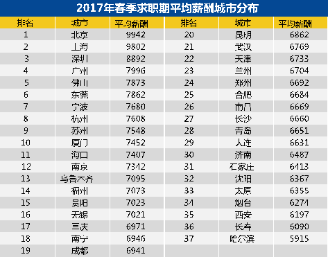 智联招聘最新公布的《2017年春季中国雇主需求与白领人才供给报告》中,从全国37个主要城市的平均招聘薪酬看,春季求职平均招聘薪酬为7665元,青岛春季求职平均薪酬为6651元。