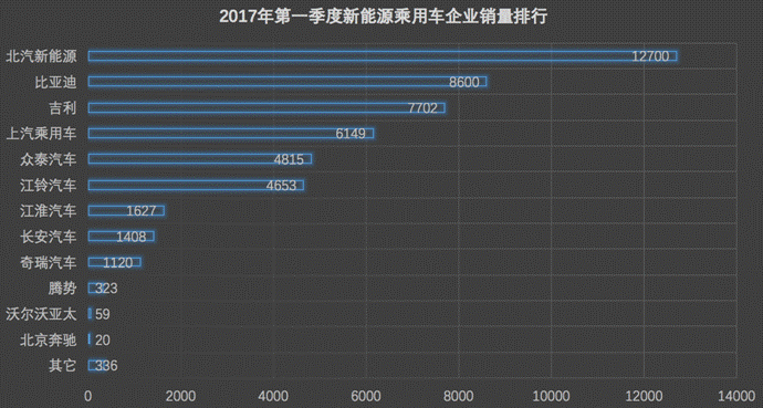 据乘联会数据显示,2017年1季度,北汽新能源同比劲增107%,累积售出12700辆,占国内1季度新能源乘用车总销量的25.65%,以超出第二名比亚迪近48%的绝对优势,获得了1季度新能源乘用车的销量冠军。