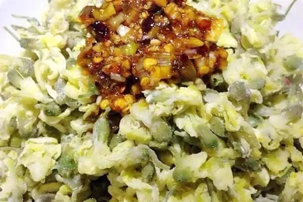 4、蒜泥、油泼辣子、少许水、香油混合后,趁热浇在槐花里拌均。