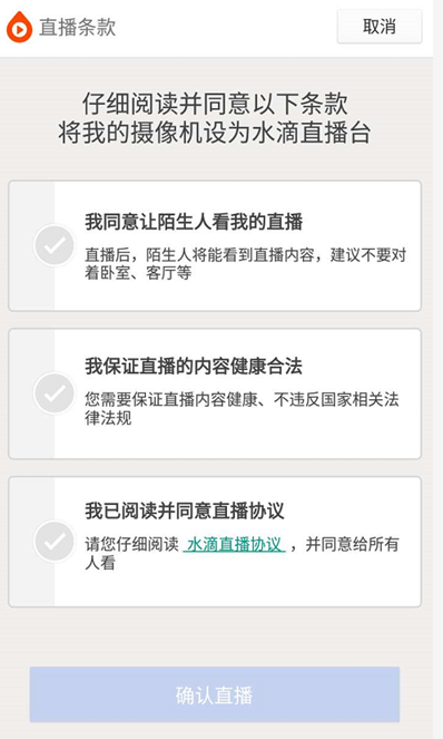 第三 直播协议已经明文公示在水滴平台官网,如:“请保证您是自愿公开摄像机,摄像机所拍摄的内容无任何您或他人的个人隐私,并确保拍摄内容健康,不触犯法律”等相关隐私保护内容。
