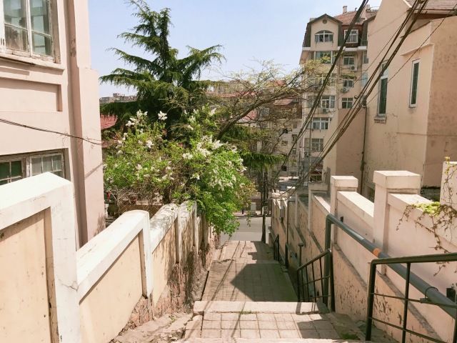 在胶州路和江苏路楼口间有一条向上延伸的小路,便是观象二路,分成两条,一条通车一条是盘旋上观象山的石阶路。