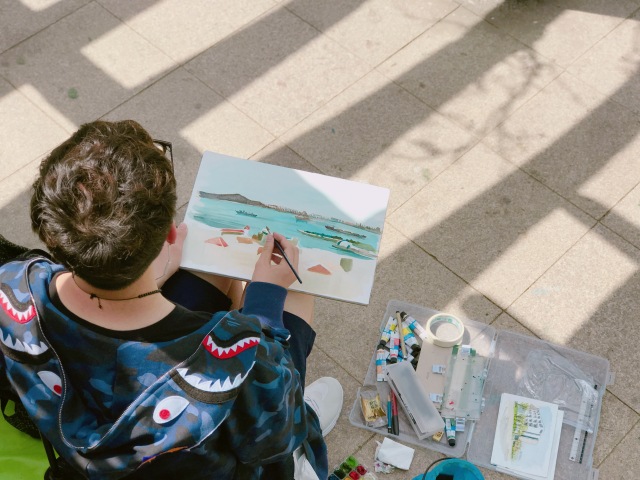 他们静静地坐在那里,手拿画笔,你不忍心发出任何声响打扰他们,想到一句话:你在看风景,而看风景的人在看你。