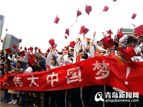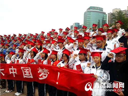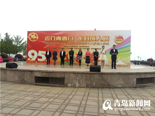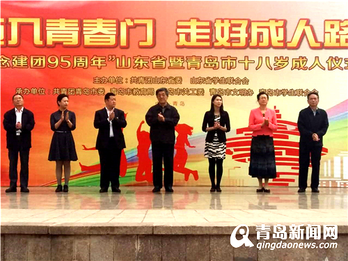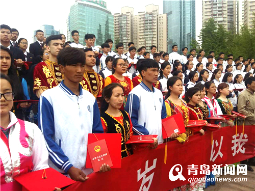 青岛新闻网5月3日讯 5月3日,为纪念建团95周年、庆祝“五四”青年节和青岛市第十八个成人节,由团省委、省学联主办、团市委、市教育局、市关工委、市文明办、市文广新局、市学联承办的“迈入青春门 走好成人路”青岛市十八岁成人礼在五四广场举行。来自青岛二中分校、外事学校等13所学校以及青岛新疆和西藏内高班的500名18岁新公民代表以及他们的家长和老师,代表全市近4万名18岁青年接受《宪法》,戴成人帽,进行成人宣誓。