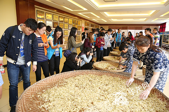 在一旁观看流程的记者编辑们也跃跃欲试,挽起袖子,提起菜刀,有模有样地拿着一个青菜头切丝。大家品茶着各种口味的手工榨菜,纷纷竖起大拇指。
