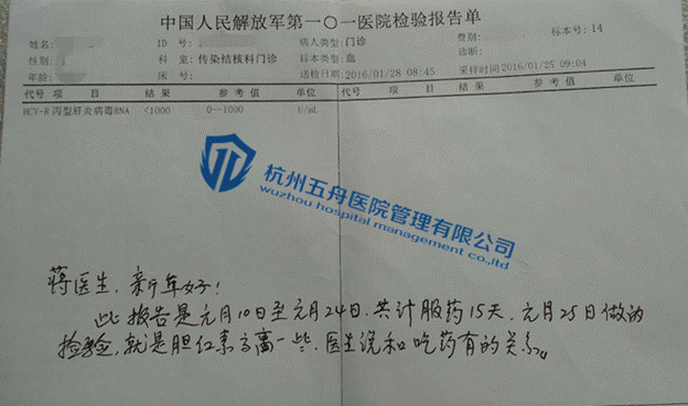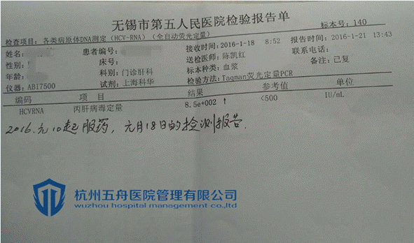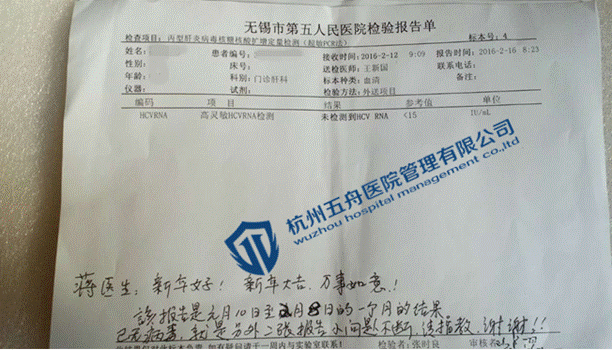 最近听说有丙肝特效药出来,卢女士心动了,虽然现在丙肝对她身体的影响还没体现出来,但不能保证以后都不会出现,所以卢女士多方打听,通过病友介绍,和杭州五舟取得联系。