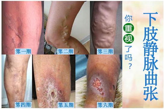 3、晚期症状:静脉曲张症状逐步加重,腿部曲张血管出现小部位破裂,导致皮肤颜色呈黑色改变,夜晚腿部出现明显痛感,甚至因忍痛,不能安心休息。如不采取有效手段治疗,任其发展可致老烂腿危险。