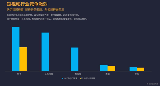 进入2017年,短视频行业市场格局发生突变。从小米应用商店公布的下载量看,快手依旧把持榜首宝座,同比去年一季度下载量也是稳步增长。除了快手,头条视频和梨视频两家新秀崛起并快速成长,下载量在今年一季度杀入前三,美拍和秒拍两家传统豪门落至第四、第五。
