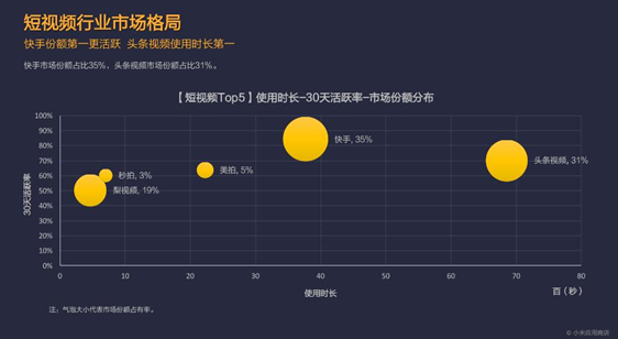 市场活跃方面,快手同样保持领先。通过小米应用商店30天活跃率数据分析,快手活跃用户超过80%,并以35%的市场份额稳居榜首。新生势力头条视频表现同样不俗,成功摘得使用时长桂冠,可见其产品的内容粘性更高,且市场份额占比31%,排名仅次于快手。