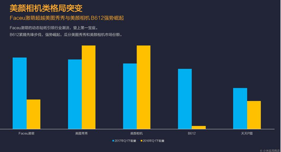 智能手机的拍照便携性和用户爱美的天性孕育出了美颜相机行业。从下载量分布看,传统两强美图秀秀和美颜相机同比2016年都出现明显的下滑,反倒是“Faceu激萌”凭借动态贴纸功能迅速笼络用户,登上了下载量第一的宝座。另外值得注意的是,过去的第一季度,B612美颜应用虽然暂列第四位,但同比增长非常迅猛,大有杀入前三名的可能。