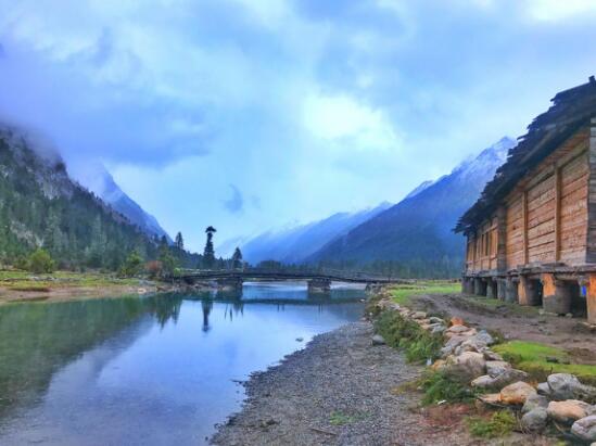 远处山下的几只牦牛和木房子勾勒出一副世外桃源的画卷