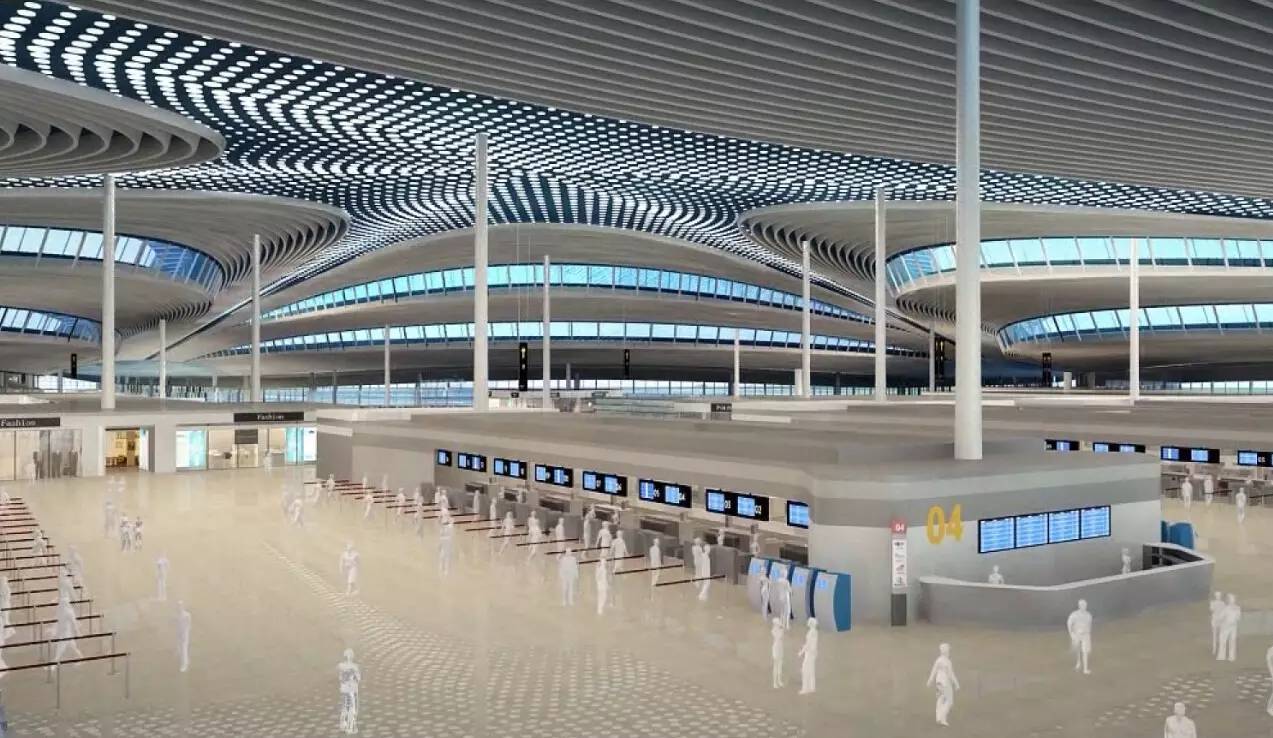 据了解,青岛新机场航站楼为国内首个采用集中式指廊造型的航站楼,以一期“海星状”、总体“齐”字状为规划布局,该航站楼构型实现了“功能优化和地域文化”的有机结合,以富有张力的连续曲面将五个指廊与大厅融为整体,实现大集中与单元式的合理平衡。