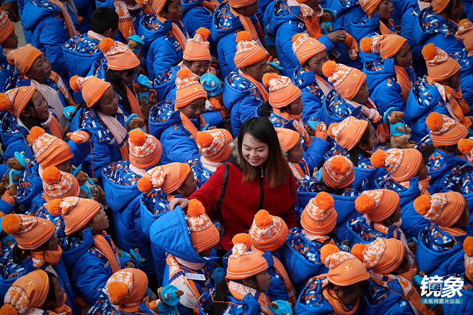 2016年12月12日,云南昭通,永善县莲峰镇大荡村大荡小学179名贫困学生领到了“温暖包”,一位志愿者为学生整理新棉衣。 视觉中国