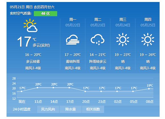 青岛20日晴 最高气温20℃最低16℃南风3-4级