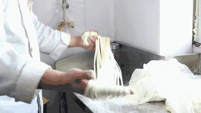 揉面、抻面,拉面的手法并没有什么花哨的,做面的师傅手法十分娴熟,拉好的面在面板上一拍,飞起的面粉就是这西镇的烟火味。