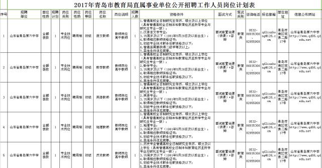 2017年青岛市教育局部分直属学校计划面试前置公开招聘聘用制工作人员41人、差额拨款事业编制工作人员4人,青岛市教育科学研究院公开招聘全额拨款事业编制工作人员6人。招聘教师岗位涉及语文、数学、英语等多个学科,大多需要研究生以上学历,采用面试前置的方式。